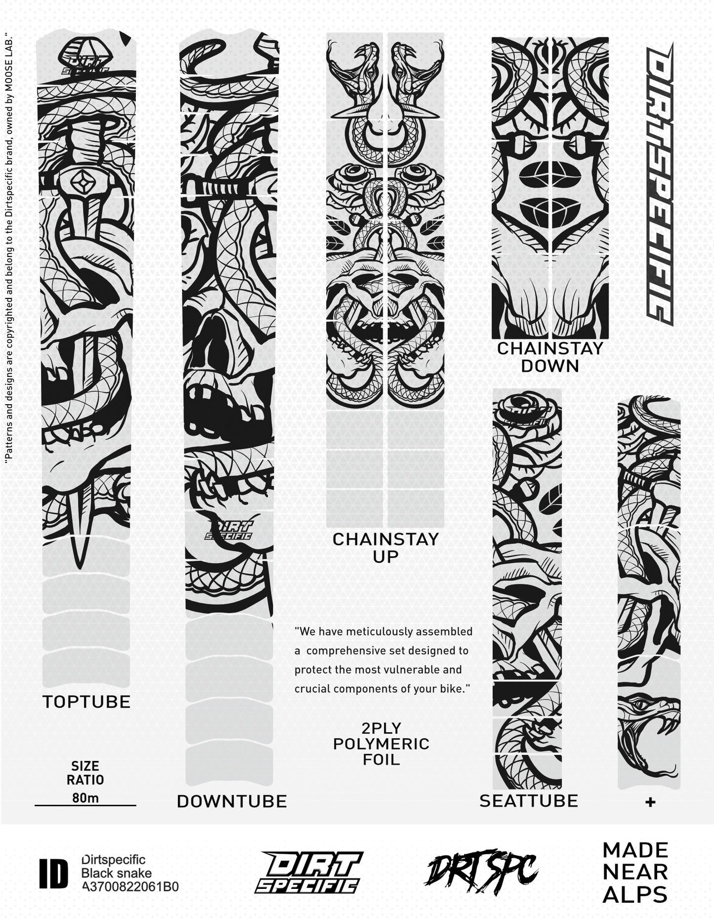 TOP TUBE - 1x L: 520mm W: 80mm⚡️DOWN TUBE - 1x L: 600mm W: 80mm⚡️DOWN TUBE UP - 3x L: 100mm W: 50mm⚡️SEAT TUBE - 1x L: 320mm W: 55mm⚡️CHAIN STAY - 2x L: 240mm W: 45mm⚡️CHAIN STAY UP - 2x L: 390mm W: 45mm⚡️Thickness : 200μm of double ply polymeric premium brand foil