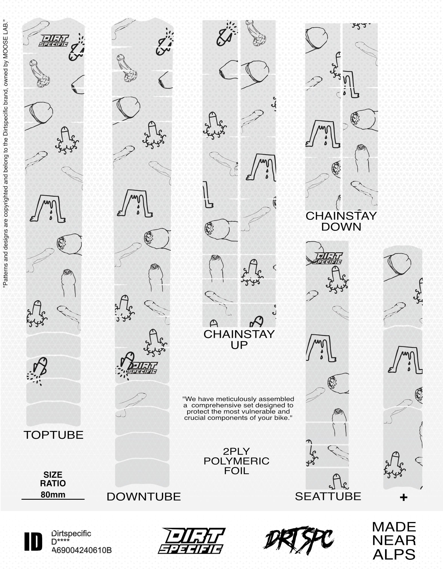 TOP TUBE - 1x L: 520mm W: 80mm⚡️DOWN TUBE - 1x L: 600mm W: 80mm⚡️DOWN TUBE UP - 3x L: 100mm W: 50mm⚡️SEAT TUBE - 1x L: 320mm W: 55mm⚡️CHAIN STAY - 2x L: 240mm W: 45mm⚡️CHAIN STAY UP - 2x L: 390mm W: 45mm⚡️Thickness : 200μm of double ply polymeric premium brand foil