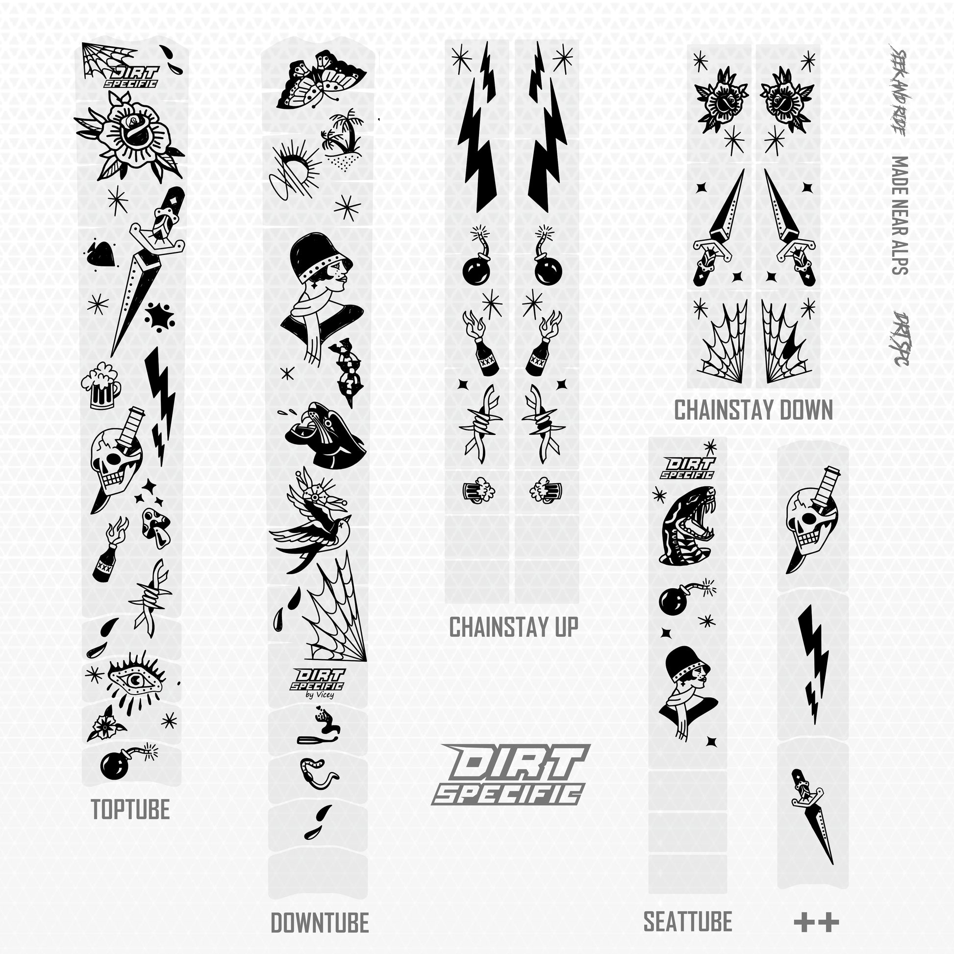 TOP TUBE - 1x L: 520mm W: 80mm⚡️DOWN TUBE - 1x L: 600mm W: 80mm⚡️DOWN TUBE UP - 3x L: 100mm W: 50mm⚡️SEAT TUBE - 1x L: 320mm W: 55mm⚡️CHAIN STAY - 2x L: 240mm W: 45mm⚡️CHAIN STAY UP - 2x L: 390mm W: 45mm⚡️Thickness : 200μm of double ply polymeric premium brand foil