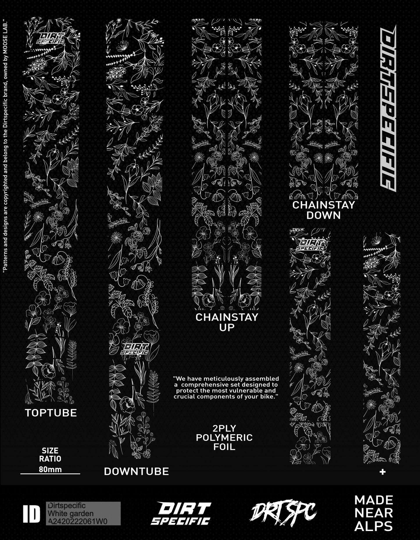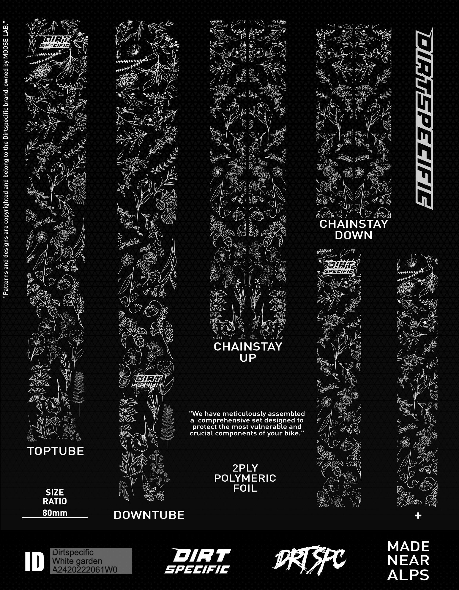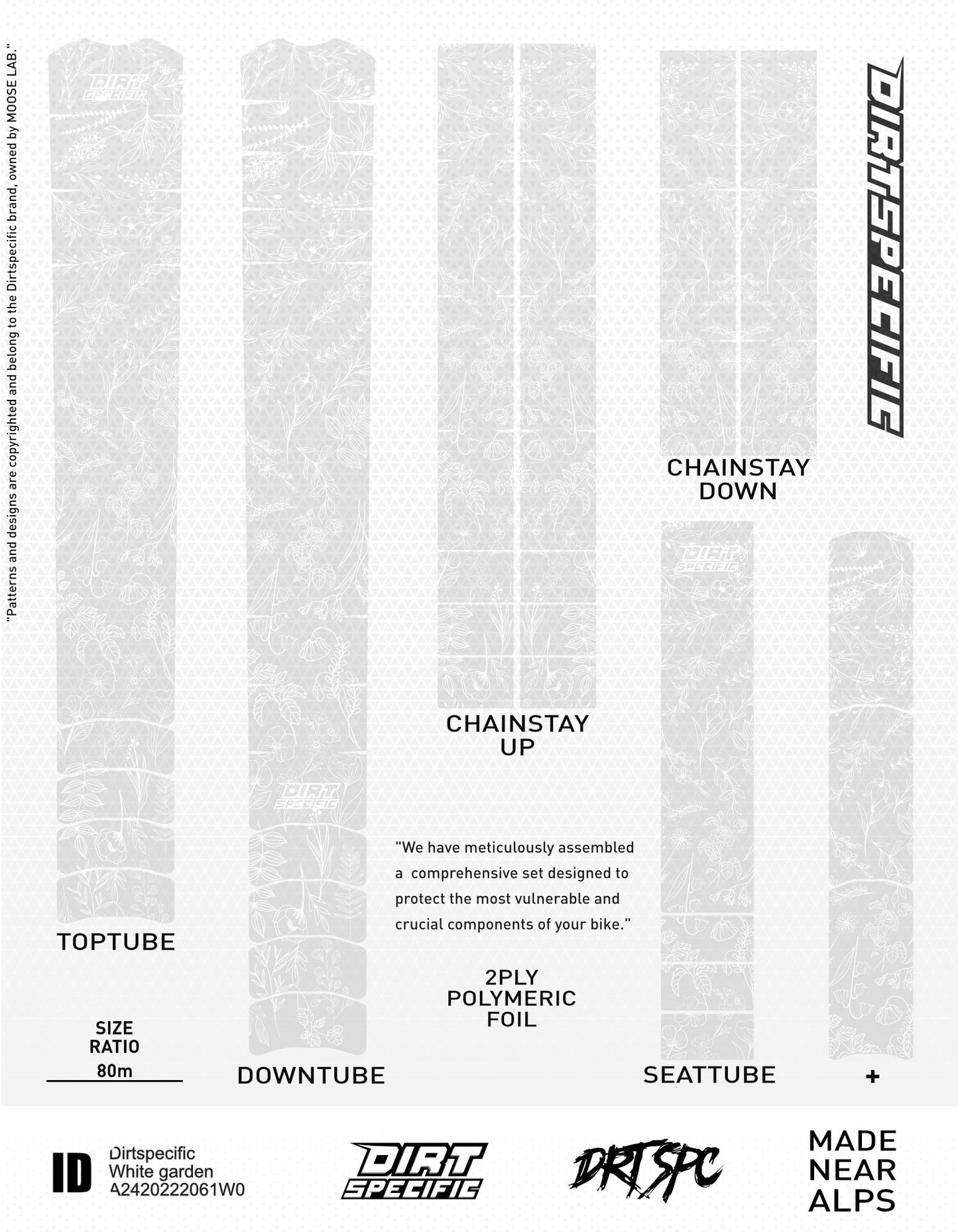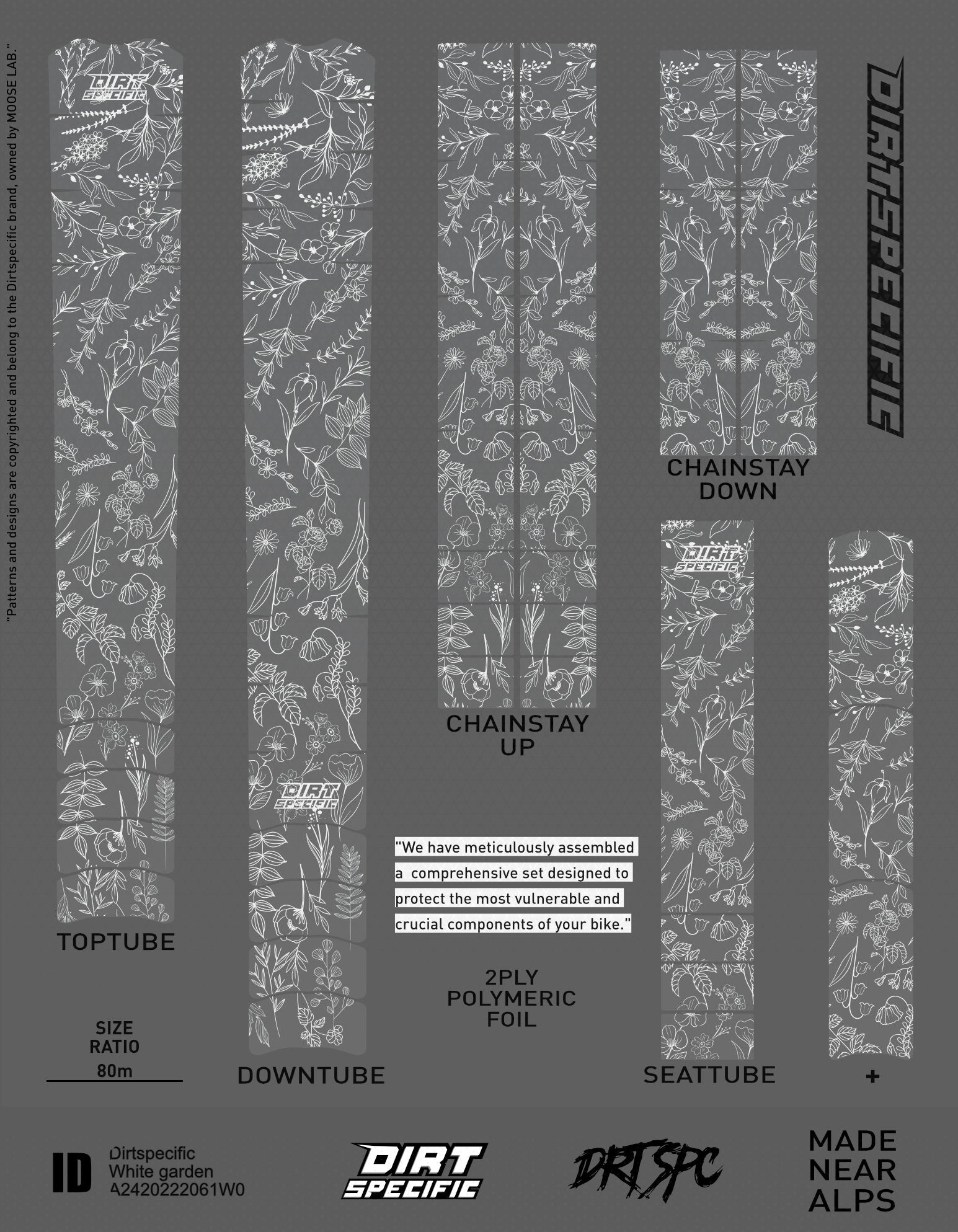 TOP TUBE - 1x L: 520mm W: 80mm⚡️DOWN TUBE - 1x L: 600mm W: 80mm⚡️DOWN TUBE UP - 3x L: 100mm W: 50mm⚡️SEAT TUBE - 1x L: 320mm W: 55mm⚡️CHAIN STAY - 2x L: 240mm W: 45mm⚡️CHAIN STAY UP - 2x L: 390mm W: 45mm⚡️Thickness : 200μm of double ply polymeric premium brand foil